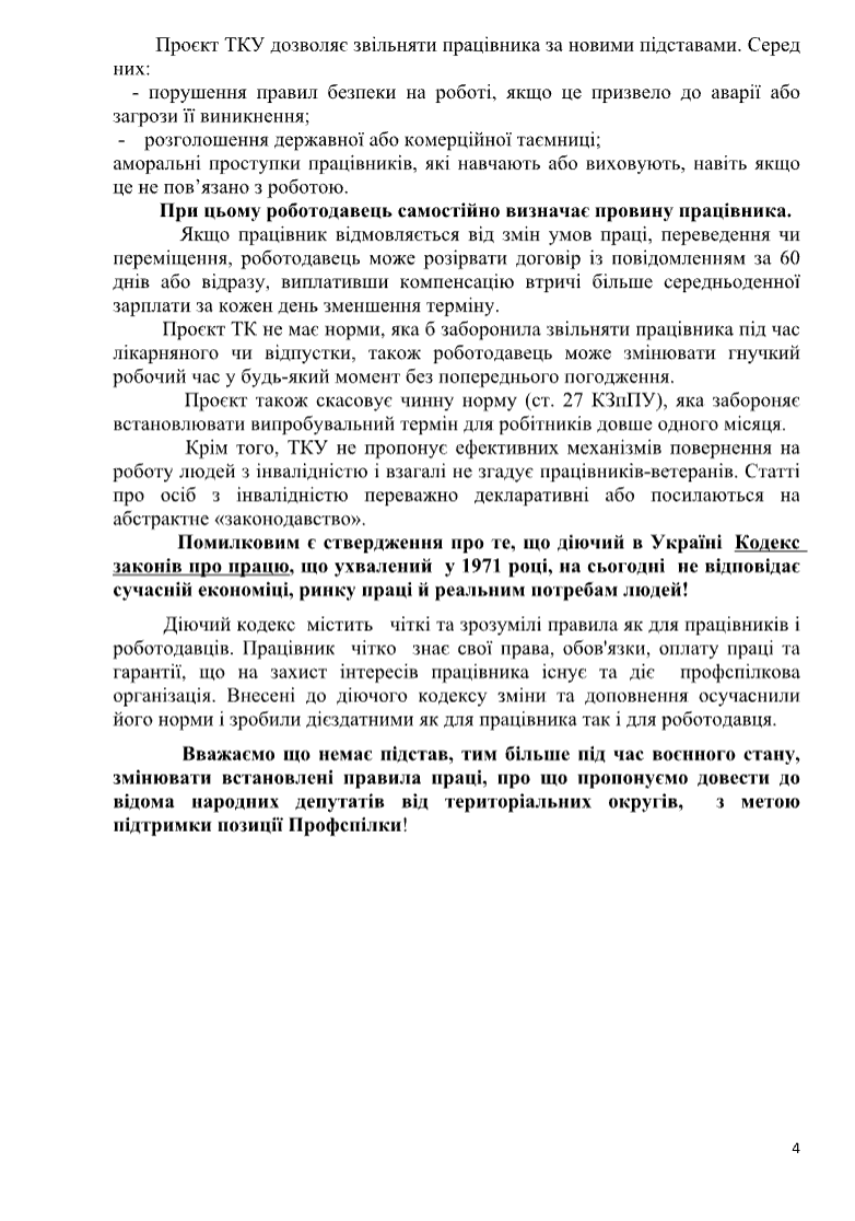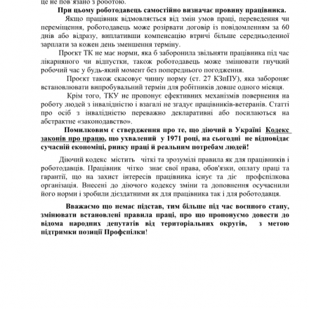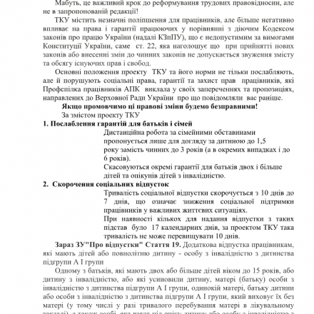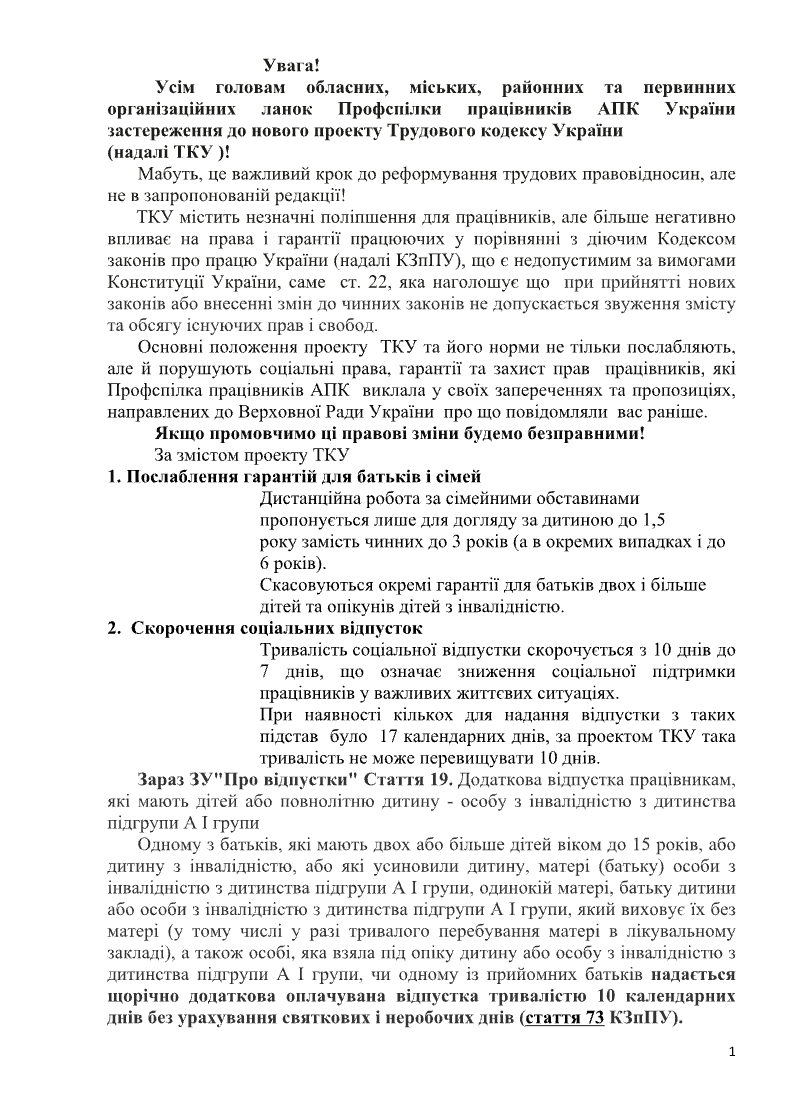 Увага! Усім головам обласних, міських, районних та первинних організаційних ланок Профспілки працівників АПК України застереження до нового проєкту Трудового кодексу України